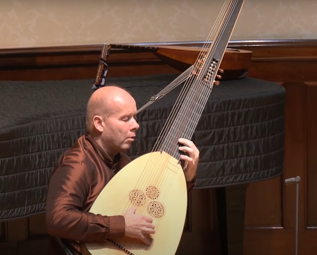 I should also make special mention of ‘Echoes in Air’, a solo theorbo piece composed by Laura Snowden last year especially for Wadsworth. A remarkably evocative instrumental, it showcases Wadsworth’s formidable touch with near-repeating chords and clusters of notes moving ‘in and out’ – louder then softer – of hearing range, taking full advantage of the resonant bass notes the larger instrument can provide. While certainly melodic, it was as much about ambience and rhythm: it stretches across the years by treating the theorbo as fully modern, with minimum fuss.
