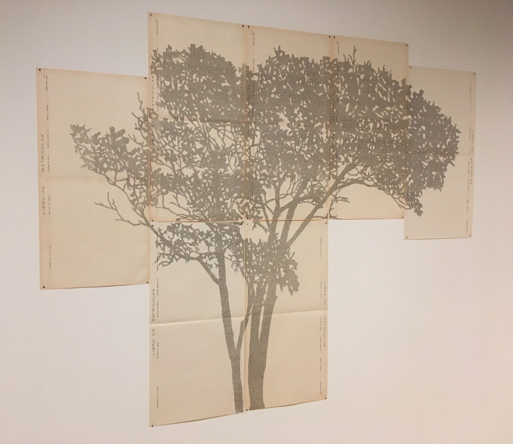 By contrast, Johanna Calle creates a wholly unnatural image, with ‘Perímetros (Nogal Andino)’: a silhouette of an Andean walnut tree. Closer inspection reveals that the dark expanse is in fact a typed transcript. The wording comes from Colombia’s Law of Land Restitution (2011); the paper from an antique land register, and the tree itself symbolises land ownership. As the gallery notes say, the piece fits into the context of Calle’s other work, which “questions the power and authority of the written word over oral traditions” – here that is, I understand, the fact that the complex texts of modern lawmaking can only attempt to do what planting trees once achieved. For me, it’s also a work of absences: the innovative medium means we do not get to see Colombia, nor those whose land was stolen. Its aesthetic of stylised typography means the tree is only suggested, not actually there: a coolly eloquent expression of displacement. Fittingly, the exhibition also includes work by one of the displaced, Abel Rodriguez, who relies on his memory to paint the home he left behind.