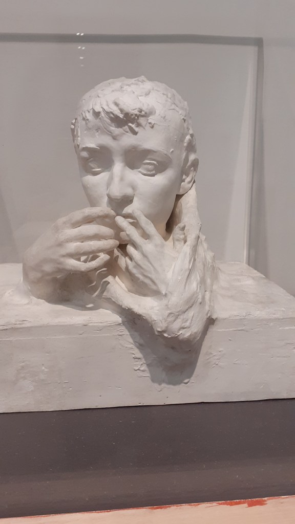 The Tate has chosen to show those aspects of Rodin’s work that place him in a modernist trajectory. However, Rodin’s work seems so embedded in the 19th century, with its emphasis on naturalism and freedom from the constraints of classical idealism, and on real weighted dynamic bodies and emotional rawness. The influence of Renaissance naturalistic sculpture is very clear; his work The Inner Voice is clearly influenced by Michelangelo’s Slaves. In the same way that Michelangelo shows a contrapposto figure struggling to escape from a block of marble Rodin’s sculptures reject classical notions of beauty and balance to communicate psychological and material states through convulsed bodies.