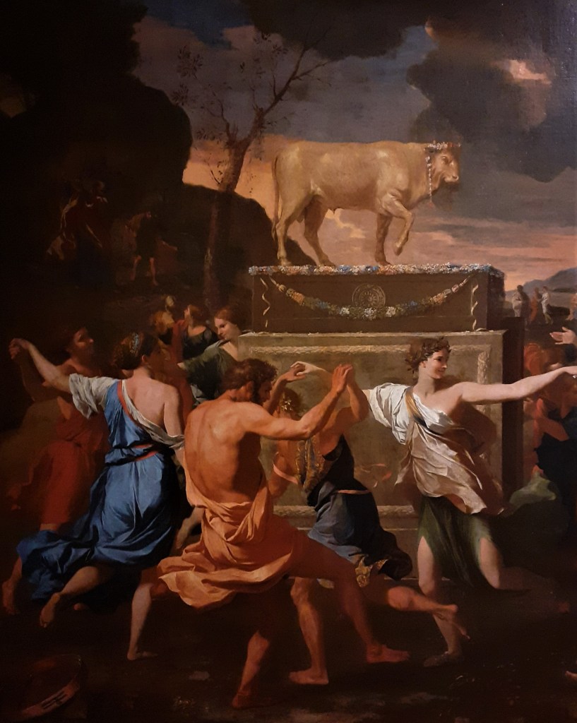 I am spellbound before Poussin’s painting of the Adoration of the Golden Calf in the National Gallery exhibition Poussin and the Dance. I have been transported to another world, one in which the Israelites, fearing that Moses will not return from Mount Sinai, have created an idol in the form of a bull. I have joined the throng of onlookers, seduced by the warm, sensual jewel-like colours of the robes of the cavorting bodies as a group of figures dances around the altar. The scene is lit by a reddish glow that forms a backdrop to the vibrant colours of the crowd. But there is an ominous darkness descending from the sky above the hills of Mount Sinai that portends a terrible happening. I notice the figure of Moses coming down from the mountain, about to throw down, in anger, the stone tablets holding the ten commandments. The painting conveys, in heightened visual form, the frailty of earthly beings and their lack of faith in God, undone by the sensual pleasures of bacchanalian revel. It demonstrates Poussin’s commitment to the austere moral values that underlie the ecstatic scenes he represents. I have been captivated many times by this painting’s dramatic composition, glowing evening light and dynamic figures, as it is part of the National Gallery’s permanent collection of paintings by Poussin. This exhibition has allowed me to understand it in the context of Poussin’s working methods, his patrons, and his general interest in dancing figures from antique sources.