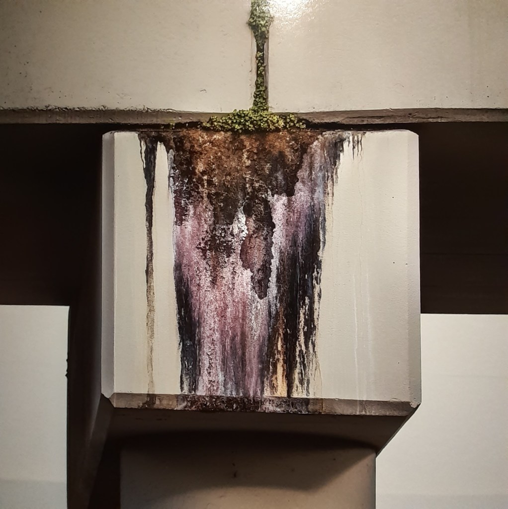Anastasia Samoylova takes photos which show the effects of the climate crisis on Miami which, because of its low-lying terrain, is prone to sea level rise and flooding. She takes photos of the encroachment of nature in the city, focusing on the vegetation that exploits damp surfaces or pools of water to proliferate. Like a vile green disease they colonise the pastel coloured building facades that have made Miami famous. Lush green hues defile carefully engineered human endeavour, trees are ripped from their moorings in the street, plants proliferate in large puddles, underground spaces are filled with seawater. Humans are presented as onlookers, seemingly divested of their power to halt the advance of the shimmering, reflecting, rising ocean. These are beautiful large format photos that show the seductive advance of natural degradation but also suggest the hubris of humans who believe that there is a human engineered solution to climate change that can combat Nature’s natural propensity to invade and occupy. She foregrounds the imagery on billboard advertisements that promote an alternative myth of the good life in Florida. One of these, (only shown in the exhibition catalogue), which shows a couple kissing in a swimming pool next to an apartment block, is attached to a wire fence in front of a construction site which reflects the pattern of the chicken wire across its surface, thus disrupting the carefully composed fantasy of the ad photo.