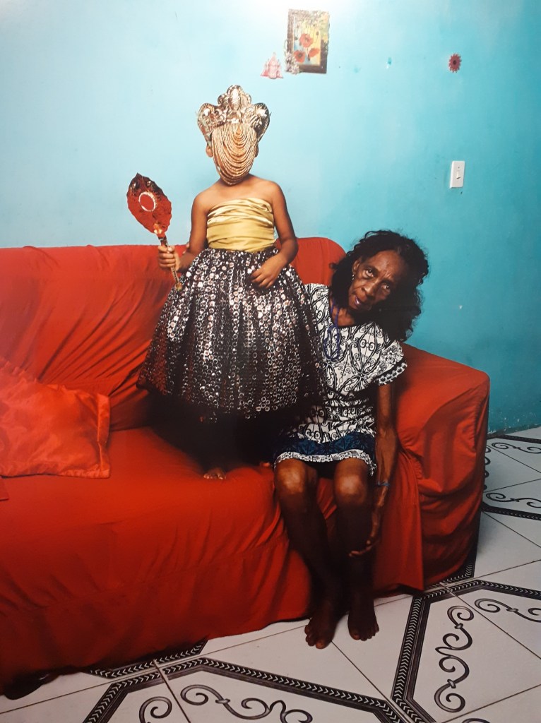 Deana Lawson’s exhibition space shows her range of experimental ventures in photography. She works with holograms which are often inserted into larger photographs; she frames her photographic works with mirrors, problematising the relationship between viewer and sitter; she tampers with photos and prints large-scale the degeneration these processes bring about, and she explores mythical Afro-American lives in large-format portraits. In the two interior portraits presented in the exhibition her sitters suggest stories and characters which demand interrogation. The main characters in Ode to Yemaya and Monetta Passing stare directly at the viewer, seeming to demand dialogue through their probing gaze. But it is a relationship we cannot fathom; like Gregory Crewdson and Jeff Wall, Lawson constructs interior tableaux, often using the same location to tell different stories. She invites strangers to inhabit her carefully composed interiors and chooses telling objects to reflect her interest in Black social and cultural life of the diaspora. making reference to interiors that she has experienced or remembered. However, everything she uses to tell her stories through her stage sets and characters become strange and discomforting; they refuse comfortable readings. The colours she uses are highly saturated, the textures sumptuous, the patterns clashing. The characters, though at first glance are recognisable, suggest unknowable, complex personal histories. The foregrounds are tipped forward so that the figures seem to spill out into our space further eradicating the barrier between viewer and sitter and thrusting us into their mysterious worlds.