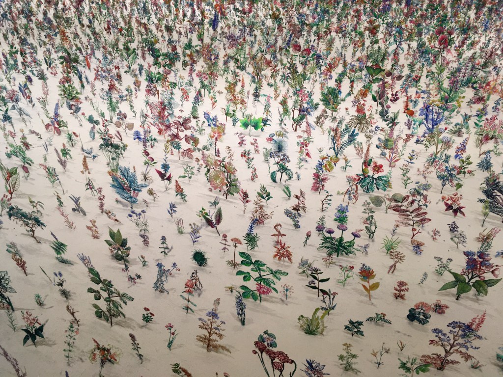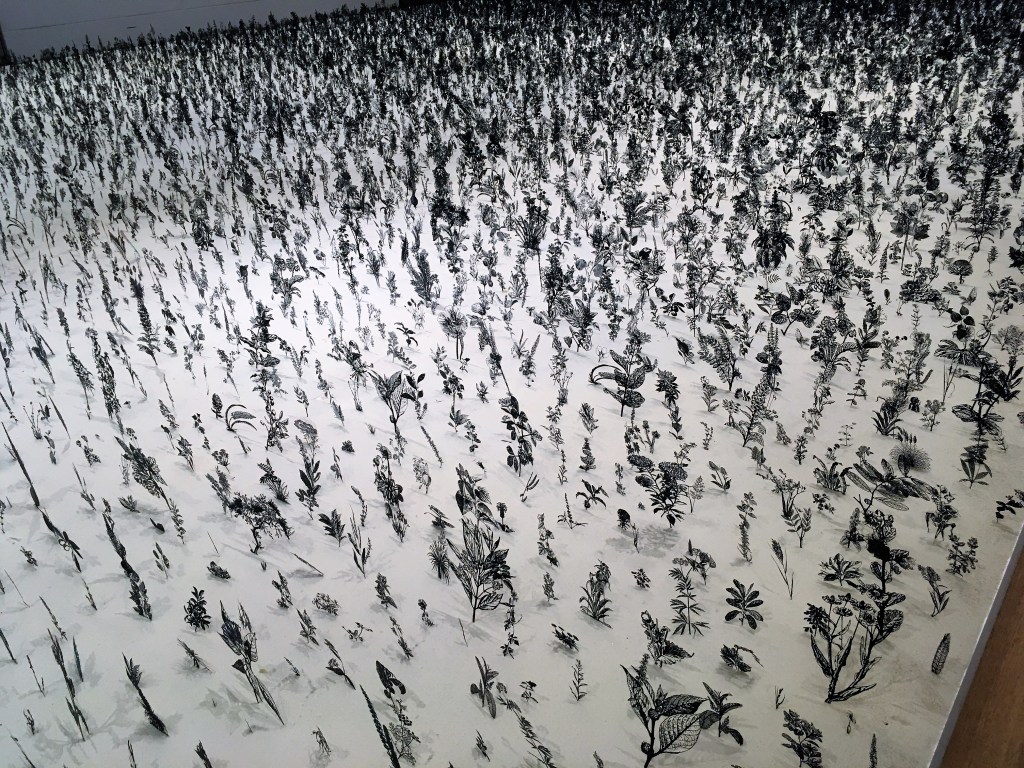 As befits its surroundings, the work’s environmental and ecological messages are clear. At the centre of the exhibition is the extraordinary ‘Blackfield’, a room-sized piece that transforms from thousands of plant silhouettes into a blaze of colour as you walk round it.