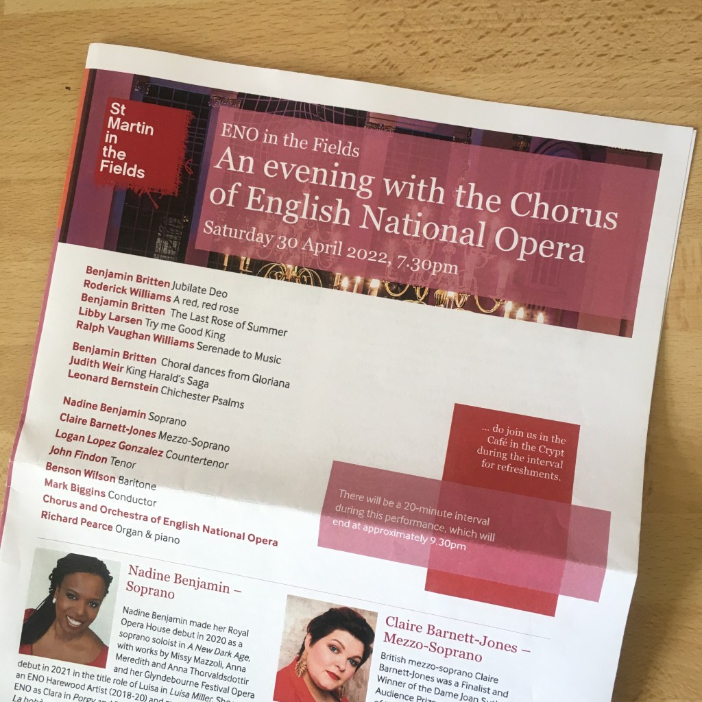 This event was part of a series called ‘ENO in the Fields’, a new initiative between close neighbours. The London Coliseum, home to English National Opera (‘ENO’), is merely a handful of eateries and one slightly alarming crossing away from St Martin in the Fields, a handsome, working church on the edge of Trafalgar Square that already leads a rich double life as a busy concert venue.