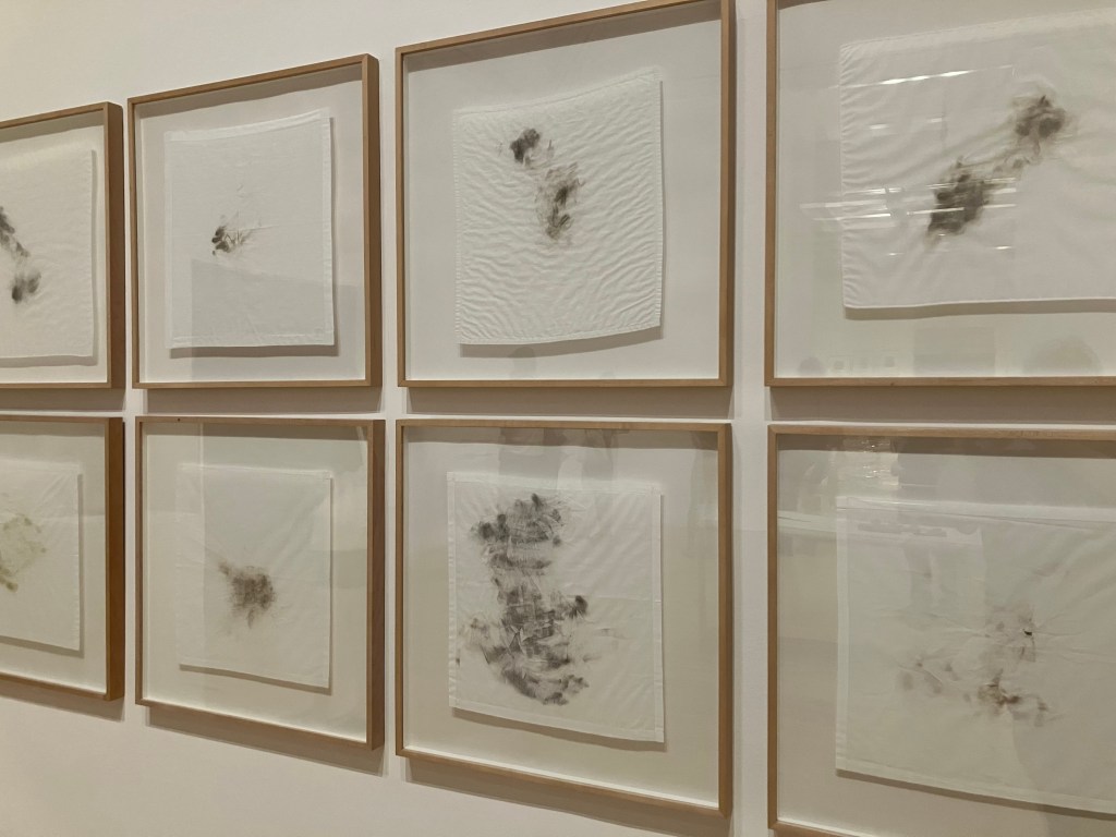 I enjoyed the story behind the ‘Stolen Thunder…’ series, where Parker polished sets of silver belonging to prominent figures then framed the tarnished cloths as abstract images. (Playing on the phrase ‘tarnished reputations’, she seemed to see this as an act of benign thievery, taking part of their glory onto herself. The challenge to the viewer, I think, is to decide whether or not this is a perfect crime. Can the images be appreciated on their own aesthetic terms, without any foreknowledge of the back-story? Should they be required to carry that weight? Does it matter? And are the images the art, or the back-story?