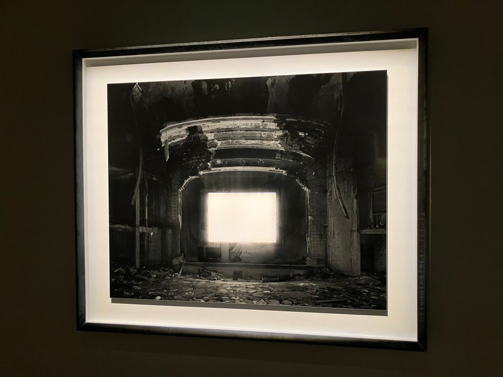 Visitors like myself who revel in cinematic photography could find themselves lost in Sugimoto’s theatres. As the interpretation explains, he ran a movie in each empty auditorium and took an exposure throughout the entire running time – so each image features a glowing white screen combining every frame of the film into nothingness. As Sugimoto takes the project into empty drive-ins and abandoned venues, he achieves the tricks of showing time both passing and standing still, and evoking art as a kind of electric presence that still gives these places a charge.