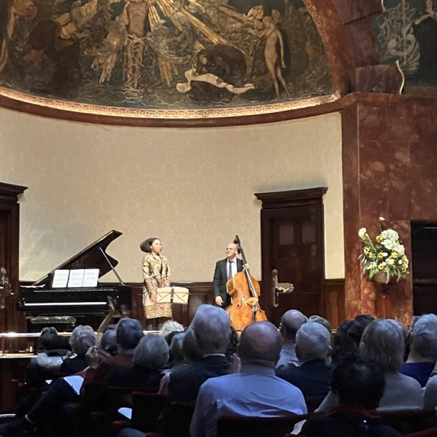 The most recent of these took place in mid-February. The afternoon concert featured Omordia herself, with double-bass virtuoso Leon Bosch. The duo were launching a new CD, ‘18 Negro Spirituals’, by playing (almost) the entire programme in sequence. Omordia introduced Bosch to a selection of spirituals after they had performed some South African folk songs together. Bosch, having grown up under apartheid, found they resonated with him deeply, and he began to gather and arrange further spirituals for double bass and piano.