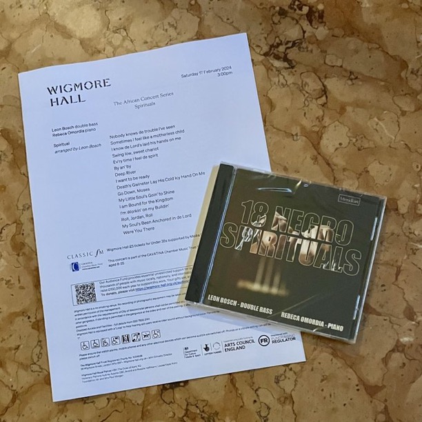 Bosch spoke from the stage about the intense pain running through the fabric of the genre. The double bass / piano versions might remove the verbal expression of this anguish, but Bosch and Omordia locate the yearning, soulful melancholy innate in the works. They introduce variations that colour any repetition, and mean the double bass is not simply an ‘imitation’ or substitute for a singer. I wonder if the spirituals struck a chord with Bosch not only because of their meaning, but because he sensed how natural a fit they would be for his instrument. In his hands, the double bass has a clear ‘voice’: sonorous but supple, capable of sorrow and resignation, leavened with moments of hope and devotion.