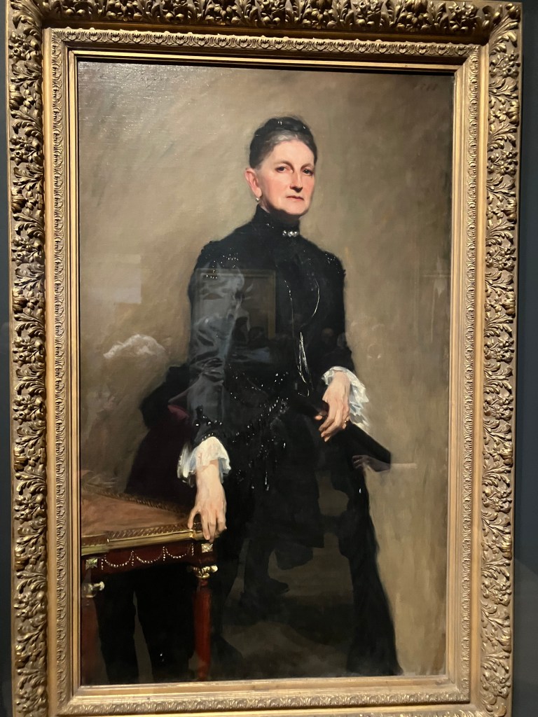 This painting of Eleanora Iselin demonstrates Sargent’s instinctive approach in a different way. Despite the sitter having a selection of gowns ready, Sargent decided she should wear the less formal dress she happened to be wearing. Not only did he apparently relish trying to capture the varying shades of black in the satin, he must have also recognised that the outfit would complement her slightly austere air: as the caption tells us, he later fixated on “that dominating little finger”.