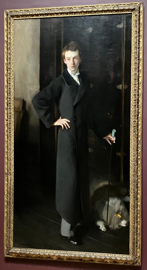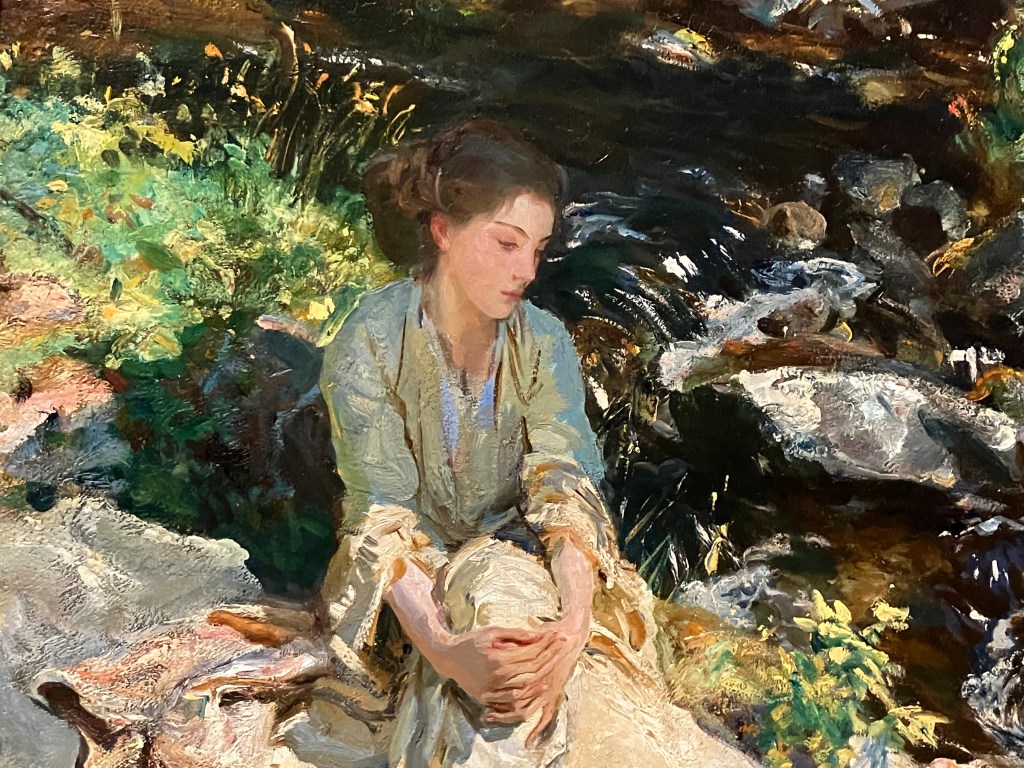 Here, the effect is even more startling as Sargent paints his niece Rose-Marie sitting by a brook. I found myself baffled by the caption here, which states this is not a portrait and that the skirt and shawl are the true subjects of the composition. To me, this is a deftly-drawn, highly-refined rendition of the face lost in contemplation, every other aspect of the painting in service to it, a swirl of Impressionistic shape and colour (Sargent admired – and painted – Monet).