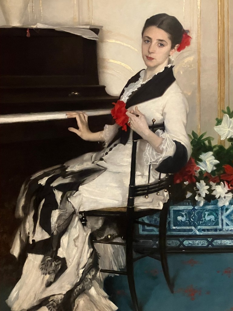 The caption for this image of Amalia Subercaseaux explains how the pose – with the sitter turning from the piano towards the viewer – is designed to showcase the dress. But again, I was captivated by her hands: the strength of her grip on the chair, complementing the long, elegant fingers resting on the keys, their careful placement suggesting discipline and technique. (Holding down a single key is a lovely touch, as though a part of her is always playing, even while she’s having her portrait painted.)
