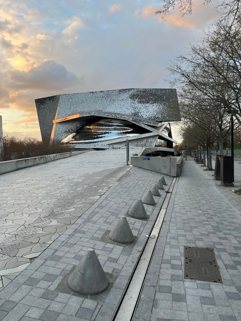 The metro ride to the concert hall was quite an adventure. Six stops from the Gare du Nord to métro Hoche, a walk to the périphérique where you are made to cross a busy road, an even busier tramway junction, finally arriving in the Avenue Jean Jaurès. The Philharmonie rises before you, its facade a face with a winking eye, or an oyster shell that gleams in the setting sun (see header photo).